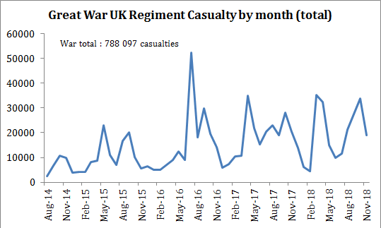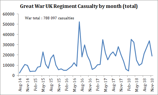 I have a new series of data concerning the casualty of the First World War that were suffered by the United Kingdom on a monthly basis from August 1914 to November 1918. All though unrelated with economics per se, I often see military history be approached without any graphs or data (with the notable exception of the “Wages of Destruction” by Adam Tooze and the Statistical Handbook of World War II). I believe that collecting such data is quite useful for the purposes of the study of military history and I hope that some military historians will find them useful.