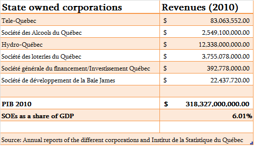 One way to estimate the importance of SOEs (State Owned Entreprises) in a given economy is to take their revenues and simply transpose them onto the overall economy as measured by GDP. So I have applied the exercice to my home province of Quebec in Canada (and I intend to begin comparisons soon). This first set is available is my “data sets” section and will be updated regularly to include other nations, provinces or states.