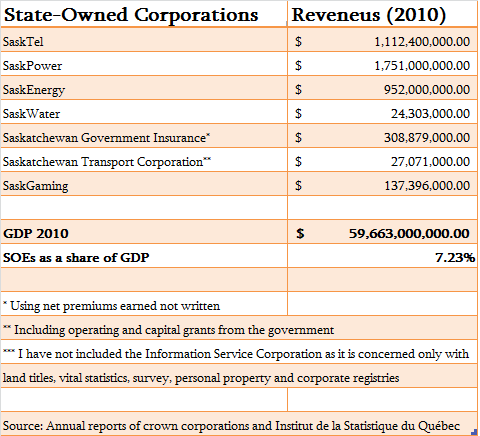 In continuance with a previous post regarding State Owned Entreprises (SOEs) in Quebec, I have assembled a new data that will allow to compare SOEs in Quebec with SOEs in Saskatchewan. Quebec and Saskatchewan are probably the two provinces in Canada that are seen by the general public as being highly “interventionistic” in the economy. Hence comparing them can be interesting as we can see in the table below, Quebec (with SOEs at 6.01% of GDP) intervenes less through SOEs than Saskatchewan does (at 7.23% of GDP).