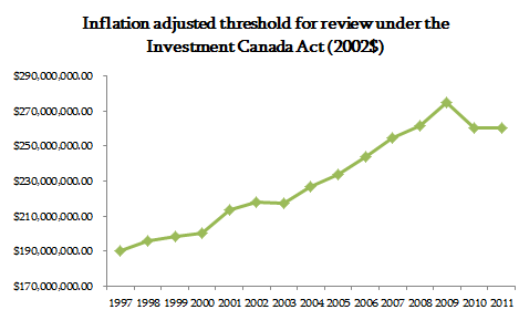Under the Investment Canada Act (ICA), the federal government has the right to review mergers and acquisitions and evaluate if they create a “net benefit” to Canada. From its implementation in 1985 to 2008, reviews rarely blocked transactions (if ever, I have not found any in literature reviews). However, starting in 2008, the threat of using the ICA to block investments has been raised (LSE-TSX merger) quite often and two transactions (Alliant/MacDonald-Dettwiler and PotashCorp/BHP Biliton) were blocked outright. For the benefits of my readers, I am publishing the inflation-adjusted thresholds for review (above that amount, the federal government has the right to review).