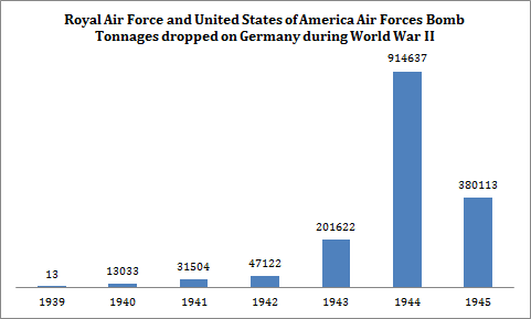 In my quest to continue to provide data to military historian in ways that are easily accessible to them, I am publishing a new data set regarding World War II. In Chris McNab’s 2009 book on the Third Reich, there are so many data series available that I feel compelled to share them, starting by this figure about the tonnage of bombs dropped on Germany by the Royal Air Force and the United States of America’s Air Force.