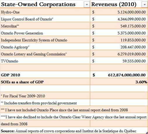 In continuing with posts regarding State Owned Entreprises in different provinces of Canada, here are the SOEs of the provincial government of Ontario as a share of GDP. Of the three provinces I have thus far posted (Ontario, Québec, Saskatchewan), Ontario has by far the lowest figure as you can see below (Quebec was at 6.01% and Saskatchewan at 7.23%).