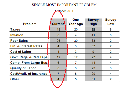 Hence, lets look at the idea of poor sales. On page 18, we see that in October 2011, poor sales was the single largest problem that firm faced (with 26% reporting). However, lets not jump six feets high yet! Relative to the same time last year, that figure has in fact dropped 4 %. Hardly a strong case. The “evil republican option” gains ground in fact when we amalgamate tax and regulatory burden, 37% of firms reported that government-imposed burdens (taxes and regulations) were their single largest problem, a figure which has not moved compared to the same time last year! The “evil republican” side could in fact add the inflation as part of the government-imposed burden, which would bring the total to 43%.