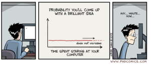 If the probability stays constant, then an idea should eventually appear out of thin air. If for every second I stare at my computer, there is one chance out of one million that an idea will emerge, then I will have an idea once every 16,667 minutes (once every 278 hours).