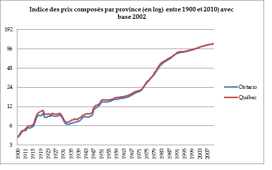 J’ai pris la peine depuis quelques mois de créer un indice de prix par province. Il faut comprendre que Statistiques Canada ne produit aucune série statistique pour l’inflation par province avant 1971. Il y a une série pour la région de Montréal à partir des années 1940. Il y a une seule série qui remonte jusqu’à 1914, mais elle est produite pour l’ensemble du Canada. Il est impossible remonter plus loin. Néanmoins, j’ai pris le papier de Emery et Levitt de 2003 dans le Canadian Journal of Economics. J’ai fait une moyenne des villes ontariennes et québécoises jusqu’à 1950 et j’ai dérégionalisé l’indice (l’indice d’Emery et Levitt était fixé à une période et à la ville de Toronto). Je pense essayer de trouver des données pour faire une moyenne pondérée. Après 1950, j’ai pris la série des Statistiques Historiques du Canada pour la région de Montréal jusqu’à 1971. Lorsque les séries s’entrecroisent, j’effectue une moyenne des deux. La série n’est pas parfaite j’admet, si vous avez des meilleures idées, faites moi en part.