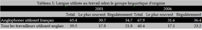 Si on est assez honnêtes pour aller consulter la proportion d’anglophones qui utilisent le français au travail, on remarque que celle-ci a augmenté. En 2001, 65.4 % des anglophones utilisaient le français au travail contre 67.9% en 2006. La proportion des anglophones qui utilisent le plus souventle français au travail a augmenté de 30.7% à 31.6%.