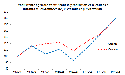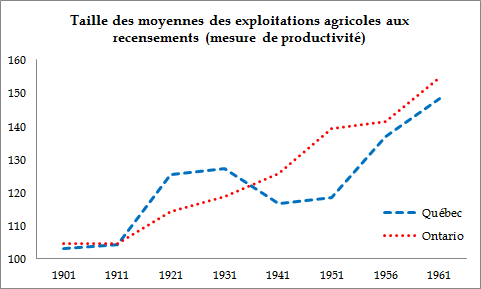 Le graphique ci-joint illustre le nombre de fermes au Québec et en Ontario à chaque recensement entre 1901 et 1961. Comme on peut voir, avant 1931 le Québec évolue de pair avec l’Ontario. Mais pendant la Grande Dépression, l’augmentation importante du nombre de fermes (avec une augmentation moins qu’équivalente de la supercifie exploitée) cause une diminution de la productivité de chaque exploitation agricole. La taille moyenne des exploitations est un bon indicateur de productivité agricole puisque des terres plus grandes permet de rendre rentable des investissements dans des outils plus à la fine pointe de la technologie tout en permettant une diversification des récoltes pour réduire les risques liés aux variations dans les prix de chaque bien agricole. Voici donc comment la productivité a évolué ainsi qu’une autre mesure de la productivité.