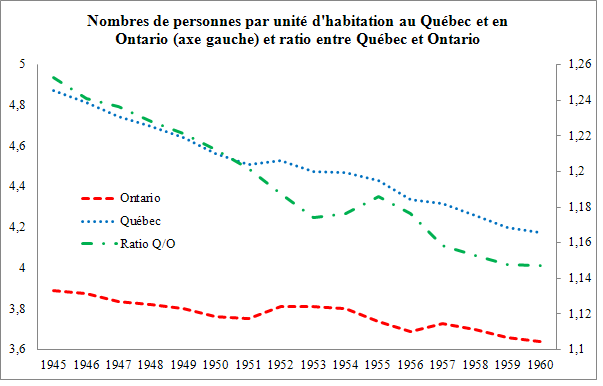 Entre 1945 et 1960, le nombre de personnes par unité d’habitation chute de 4.87 à 4.17. Cette proportion demeure nettement au-dessus de celle de l’Ontario à 3.63 en 1960. Toutefois, l’écart en 1945 était de 25% alors qu’il est de 14% en 1960.