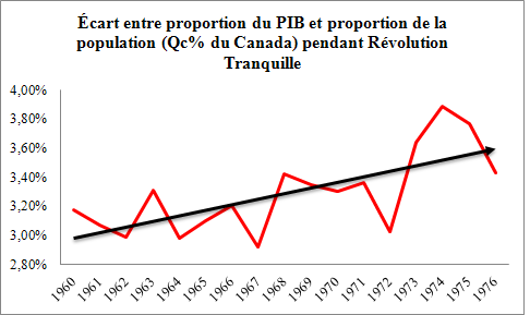 - entre 1945 et 1960, le Québec maintient sensiblement sa part et il y a des chances que si la tendance s’était continuée, le Québec aurait pu fermer l’écart;