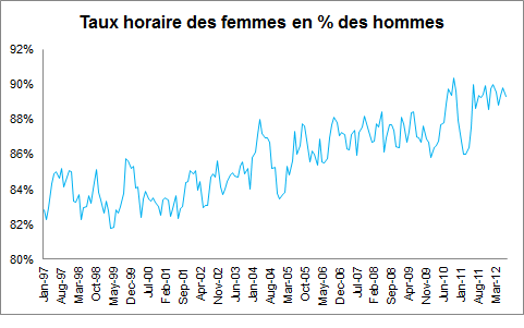 Pendant le débat, Françoise David a affirmé que les femmes gagnaient moins que les hommes par environ 25% en revenus annuel. Est-ce qu’elle a raison? La réponse c’est oui, mais c’est trompeur. Le revenu total est en partie le résultat du nombre d’heures travaillées et les femmes travaillent font moins souvent des heures supplémentaires et lorsqu’elles en font, elles en font moins que les hommes. Elles occupent aussi des emplois moins risqués (le risque créant une rémunération plus élevé). Alors il faut regarder une autre statistique, le taux de salaire horaire. L’écart est plutôt de 11% et il se ferme depuis 1997.