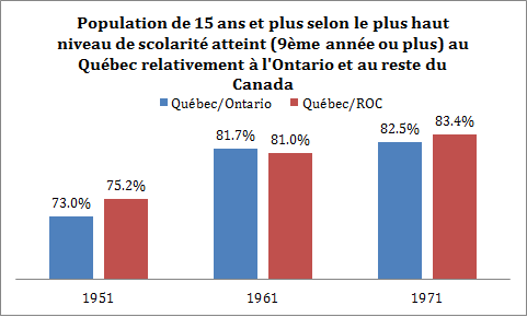 La deuxième faille de son raisonnement c’est de ne pas se demander si les progrès observés entre 1960 et 1976 sont en continuité avec ceux de la période précédente. Et bien, à cet égard, le Québec a rattrapé énormément entre 1951 et 1961 et a continué de le faire par la suite.