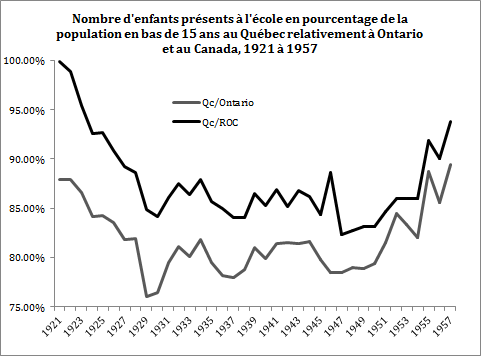 “While the school-enrolment rate of children below 15 years of age in Quebec stood at 79 per cent of the level observed in Ontario in 1945, that proportion had jumped to 89 per cent by 1960. It reached 94 per cent in 1975. Quebec reduced the gap with Ontario by 10 points between 1945 and 1960, but by just five points between 1960 and 1975. Most of the catching up was achieved before, not during, the Quiet Revolution.”