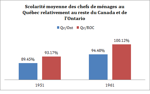J’ajoute aussi la présence effective à l’école (parce que jusqu’aux années 1950, il y avait énormément d’enfants inscrits dans les autres provinces qui n’étaient jamais présents à l’école alors qu’au Québec, le pourcentage d’inscrit était plus bas, mais le taux de fréquentation quotidien était supérieur) et la scolarité des chefs de ménage (pour les personnes apportant le revenu à la ménage, le niveau d’éducation est une bonne mesure du niveau de rattrapage économique par ailleurs).