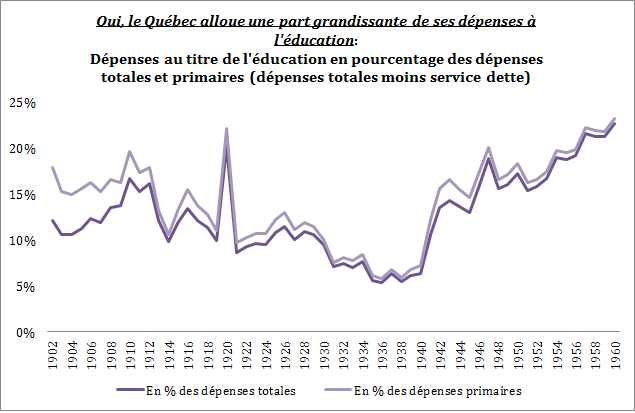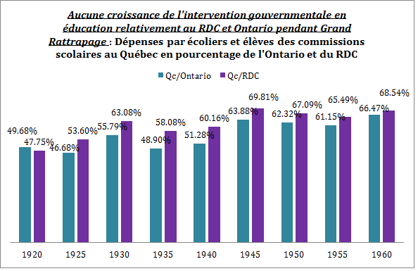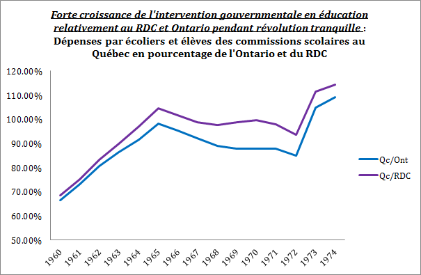 Le Québec n’est pas ultra interventionniste avant 1960. En fait, relativement au reste du Canada, il ne l’est pas plus et pourtant son rattrapage s’effectue rapidement. C’est-à-dire que les progrès éducatifs du Québec sont plus rapides que ceux dans le reste du Canada. Maintenant, si on regarde après 1960, on voit que les dépenses du Québec explosent relativement au reste du Canada. En fait, elles les égalisent. Est-ce que le rattrapage du Québec s’accèlere? Non et je l’ai bien documenté dans mon texte du Devoir (et dans mon livre), le retard continue de se fermer à une vitesse constante. Notons aussi que plusieurs veulent comparer le Québec à des utopies parfaites (je ne pense pas que ce soit le cas de M.Robert, mais certains autres de mes critiques) alors que des documents comme le rapport de la Commission Hope en Ontario rapporte des problèmes similaires au Québec en matière de financement et de participation scolaire (ici)