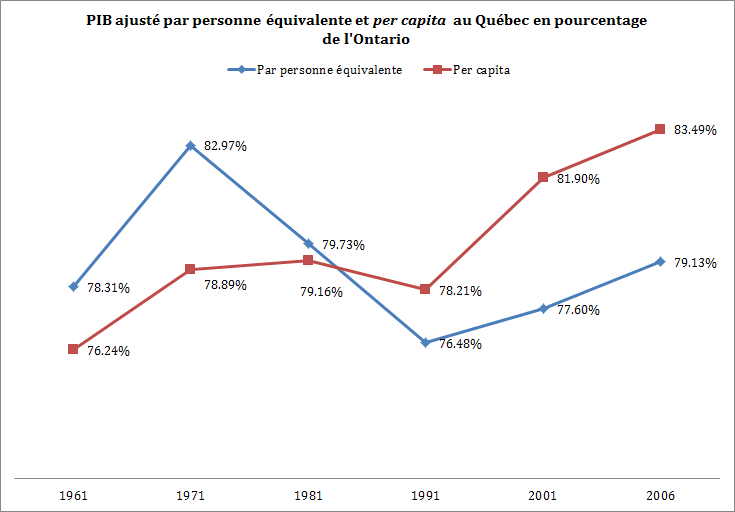 En prenant les données des recensements de Statistiques Canada, on remarque que la taille des ménages au Québec diminue beaucoup vite qu’en Ontario depuis 1961. Ceci nous laisse croire qu’en prenant le PIB par habitant, nous pouvons sous-estimer la performance du Québec quand les ménages sont en moyenne plus larges que ceux de l’Ontario et surestimer cette performances quand les ménages sont plus petits.