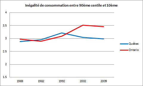 Qu’en est-il des inégalités entre la classe moyenne (la médiane) et le 90ème centile? En 1969, la consommation des Québécois de la classe moyenne était 1.66 fois plus basse que la consommation du 90ème centile contre 1.68 fois en Ontario. En 2009, ce ratio avait grimpé à 1.70 au Québec et 1.82 en Ontario. L’avantage du Québec est nettement moins important à cet égard, mais tout de même présent.