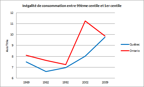 En 1969, les Québécois faisant parti du 1% le plus riche de la population consommaient 7.49 fois plus que le 1% le plus pauvre. En Ontario, on parlait de 8.11 fois plus. Jusqu’en 2009, ce ratio a grimpé à 9.77 au Québec et 9.87 en Ontario. À ce point, on réalise que le portrait du “succès québécois” est nettement moins glorieux.