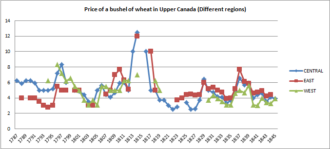 Still in line with my articles regarding market integration in Canada prior to confederation, I am posting what prices in Ontario looked like before 1845 and between the different regions. It seems that prices were moving together and closely together.