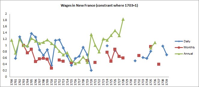 In collecting price data for New France which is a chapter in my thesis, I discovered data on wages during the era of French rule. Most of the existing data about wages concerns skilled labour, which was scarce and growing scarcer as the colony deurbanized from 1700 to 1760. Although the data I collected does not specify always what was the labour employed, the Séminaire de Québec (an institution operated by religious officials which kept very exhaustive account books) mostly hired labourers on the farms it owned and individuals who also possessed farms. In short, this was actually closer to non-specialized labour and more representative of what work individuals who shifted labour inputs between farming and other complementary activities. This dataset contained 423 observations of wage paid from 1700 to 1739. These are 423 observations spread over three types of labour duration (daily, monthly, annual).The largest sample comes from annual observations which was often contracted for transporting for the séminaire, labouring and plowing fields, clearing land, building fences etc. The annualized data is probably the most reliable. However, the data collection is not finished especially since I have yet to complete the account books after 1728. At present, all data that is annual and prior to 1728 is probably the best in the sample (I will present finalized results when completed).