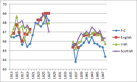 The figure shows the heights in inches by year of imprisonment of males above 20 years of age according to ethnic origin.