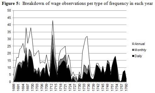 As for the wage data, figure 1 illustrates the distribution of the data collected. Monthly and annual wages are not discussed here because they are few in numbers and the nature of the work for which they were given is not always specified. Moreover, they were often indentured workers with payment-in-kinds that were not specified. The daily wages are much cleaner. Very rarely were those wages associated with payment in kind, so we have very little problems arising from underestimated wage levels. When they were, the account books added the notice of “et nourry” (and fed) to the wage rate, or mentioned a specific item that was offered. Some of the tasks of the workers were identified through their surnames (Masson meant mason, while Meunier meant miller). Most of the time, the tasks were specified. When they were not, it was possible to use the Séminaire’s indexed name cards to find who these individuals were, allowing us to complete the information about each observation. Like the prices, the wages were reported in monnoye du pays. The early data for carpenters is missing for 1688 and 1689. The value observed for 1690 was attributed to these. The same problem was observed for 1688 with unskilled wages. I attributed the 1689 value. All other subsequent interpolations, which are very rare for unskilled workers but not for carpenters, were made using the MATLAB software and the “iterpl” function from the set of the 1-D interpolation methods. The option “spline” was used for the method of interpolation. This option represents the piecewise cubic spline interpolation method as in de Boor using not-a-knot end conditions. The usage of the piecewise treatment helps to avoid Runge’s phenomenon of oscillation of polynomials of higher degrees and decreases the interpolation error compared to linear or simple polynomial interpolation methods (de Boor 2001:23). The interpolation has been kindly provided thanks to the help of Vadim Kufenko of Hohenheim University’s department of economics.