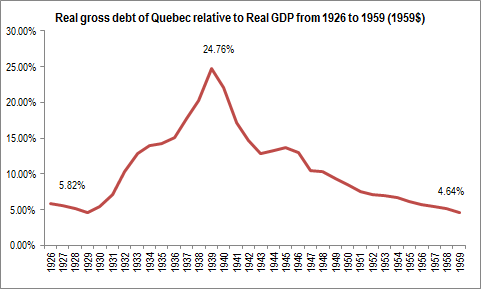 To continue with my preceding post of Friday on Quebec’s debt between 1900 and 1959, I am publishing the debt-to-GDP ratio which sadly can only begin in 1926 since the only series I have with regard to provincial domestic product begins in 1926. However, it is quite telling that in 1959, Quebec’s debt stood only at 4.64% of GDP. At the start of the war, the figure increased dramatically to slightly above 24 %. This is quite telling because it illustrates how the government of Quebec grew massively during the 1930s (it did grow as I will show in future weeks).