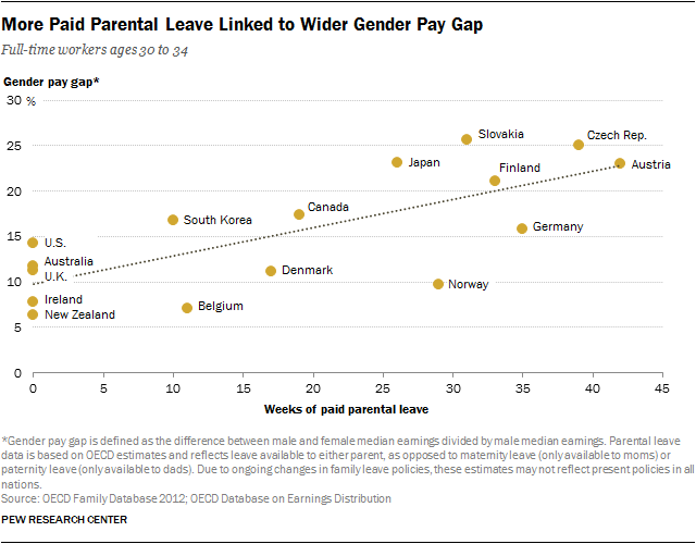 But more simply, it creates inequality. That government program incentivizes families to reduce the time spent at work at the expense of future earnings. Whilst as a society, we might value the presence of mothers at home (and hence value maternity leave programs) but we have to understand that this comes at a cost : higher inequality between male and female. This is the case because longer periods spent off the market have a large effect on the wage gap. As the OECD recently explained in a 2013 paper :